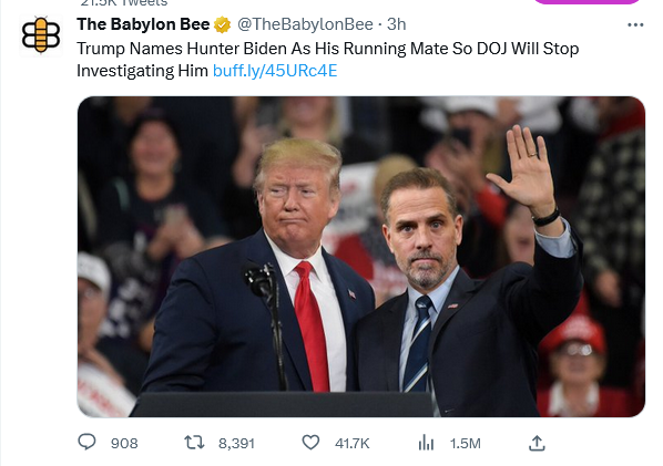 PALM BEACH, FL — Former President Donald Trump seemed to have outsmarted federal prosecutors once again, as reports out of Mar-A-Lago indicated the 45th President and current 2024 candidate had chosen Joe Biden’s son, Hunter, as his running mate, leading the Department of Justice to halt all investigations against Trump.