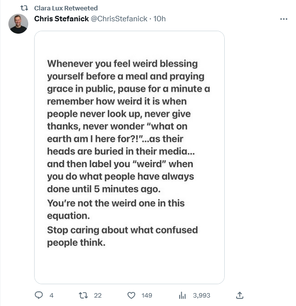 I have many flaws and sins. But what other people think of my religious devotions never enters my mind. I recall a non-Catholic Judge, a good guy, thought I had dirt on my forehead on Ash Wednesday. (This was many years ago prior to Ash Wednesday becoming a thing in some Protestant churches. ) He was extremely apologetic after I explained, but I noted to him that no apology was necessary as he hadn’t known and I was happy to explain.