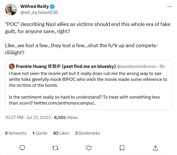 Ms. Huang is of Chinese ancestry. During their war against China which lasted from 1937-1945, the forces of the Empire of Japan killed about eighteen million Chinese civilians. No one one truly knows how many additional tens of millions of additional Chinese civilians died of famines caused by the occupation of a substantial part of China by Japan and the Japanese stripping those regions of much of their food resources. Among many other intensely evil ramifications caused by Japanese aggression in Asia, that was stopped courtesy of the US atomic bombings.