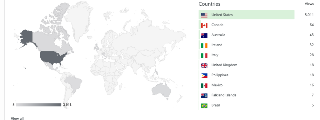 Most of our readers come from the US, but we also have readers, and commenters, from abroad, The above lists our visitors yesterday. I was struck by the 7 visits from The Falklands. Shout out to our Falkland readers!