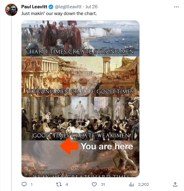 I think the meme is popular now because we see in the West populations unable and unwilling to fight, with confused sexuality too often popular among the young. Has prosperity caused this? In part. I think the bigger culprits are a breakdown of the family and a turning away from traditional religion. The culprit, as often when Man goes off the rails, is a worship of self uber alles. The restraints put on this ever present temptation to just look out for number one have been weakened through legislation and general increasing prosperity, so increasing prosperity is part of the problem, but only part.