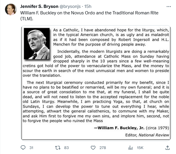 Yes it is mind boggling how the 1960’s destroyed nearly everything it touched. I am a convert (1982) and even I can see how lousy the music and NO are. My upbringing in a tiny Baptist church was more orthodox than my current parish. My wife and I do lots of remedial Catholic studying to understand God’s word as softball homilies won’t help. Buckley was/is right. And he didn’t even live long enough to enjoy the Evil Clown yrs of today.