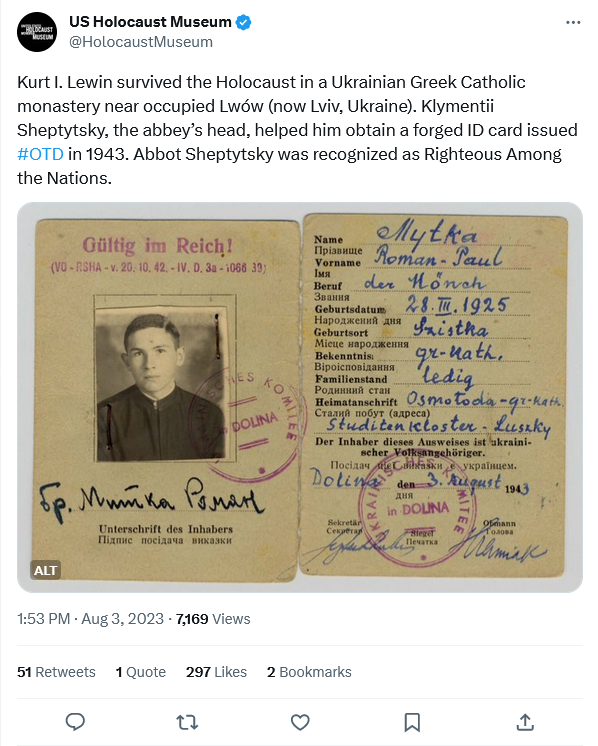 Klement was the younger brother of +Andrei Sheptytsky, who was the head of the Ukrainian Catholic Church for over 40 years, until his death in 1944. Shortly after that the church in Ukraine was forced underground. Almost all of its bishops and many clergy and religious either died or were sent to camps in the Soviet Union. +Klement died at age 81 in a Soviet prison. They were both very remarkable and brave men. This fellow was just one of many Jews saved by the brothers