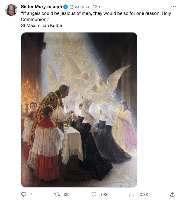 Michael, the Archangel told the children at Fatima the one thing he wished he could do is receive the Holy Eucharist