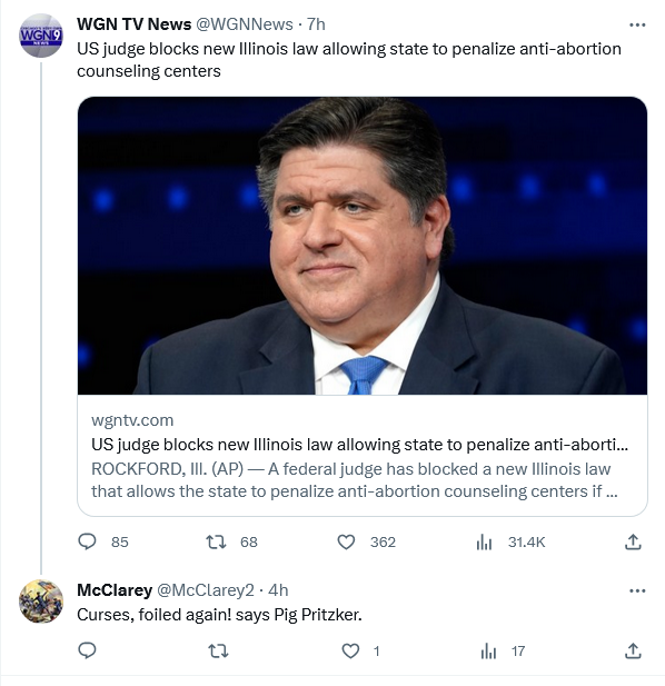 Meanwhile, JB the Hutt is now proposing to hand out $5 million in “Build Illinois” grants to abortion facilities. These grants would be distributed by the same agency that gives economic development grants to businesses for things like pandemic relief, tourism promotion, and green energy projects, and they will be funded from money set aside for infrastructure related projects. IOW, our governor considers abortion to be an essential State industry and as much a part of our “infrastructure” as roads, bridges, and public buildings. Thank God for this judge, at least, not allowing him to stamp out the competition for his “essential industry”.