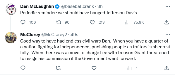 The comment is doubly dumb, because Davis was not guilty of treason in the first place. He was guilty of secession, which was no crime at all. Hanging him would have been the equivalent of a lynching. I wish Americans would get over their third grade understanding of the Civil War.