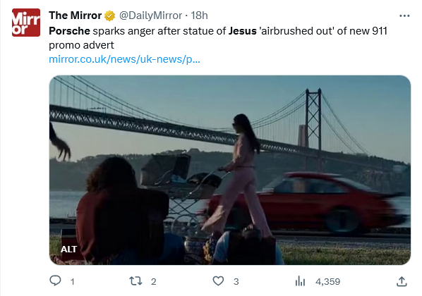 Porsche, having been caught, has apologized for the “mistake”.   Go here to read about it.  When it comes to cancel culture, Christ is usually the real target.