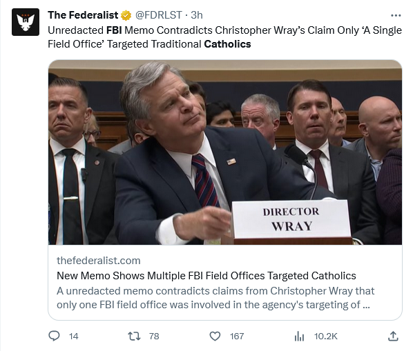 Go here to read all about it. I recall from the 80’s an advertisement which had a civil war soldier with a musket pointed at the viewer. It noted that if the Battle of Gettysburg were fought today, you would be the enemy. To the powers that be in the FBI, believing Catholics are the enemy.