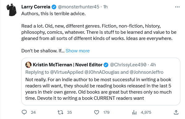 This has led to a bit of a back and forth between those stressing the importance of reading the classics and those saying that what matters is getting new readers. I don’t know that there is actually that much disagreement among the core players. For example, Kristian McTiernen has since repeatedly claimed that she meant that you shouldn’t SOLELY read old works. This is probably in reference to Jeffro Johnson’s (who she tagged) slogan “Never read anything published after 1980.” But it’s obvious that this is rhetoric and not a serious claim since Johnson consistently advertises new indie books.