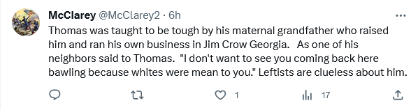 When he was growing up Thomas had the nickname ABC: America’s Blackest Child. The Leftists who think they can buffalo this man into resigning lack all comprehension of what he overcame in his ascent to the Court.