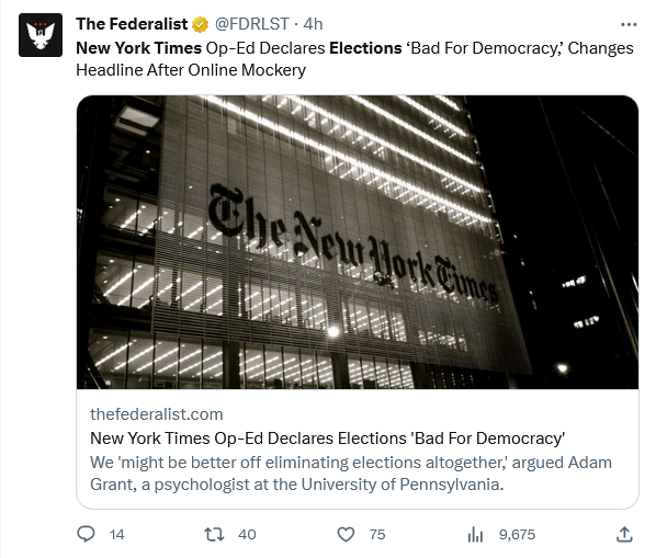 The Woke have no use for elections. They believe they have the Truth and everyone should be forced to obey them. Any system is better than one in which Deplorables get to vote. Go here to read how The Babylon Bee predicted this.