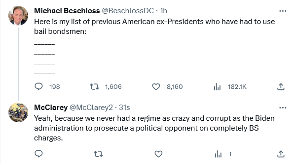 Interesting that many of the folks gloating over the Democrats’ repeated indictments and prosecutions of Trump were the same people who gravely informed us that if Trump’s DOJ prosecuted Hillary Clinton over her illegal email servers and mishandling classified information (not to mention destroying evidence)— why, that would be the action of a dictator and the devolution of America into a banana republic.