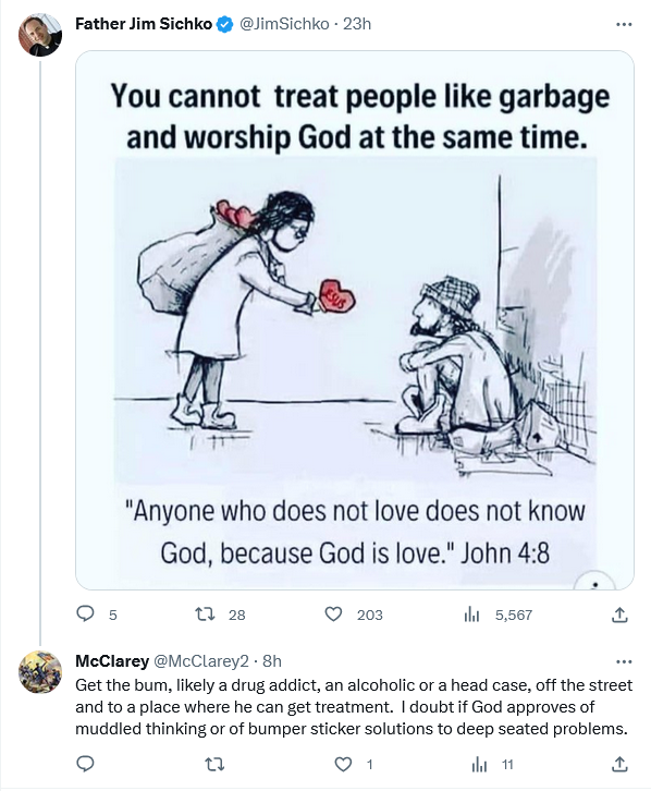 It is very far from love to let people camp on the streets, sometimes a menace to themselves and to others, when they could be placed into shelters to receive food and help.  To pretend this is akin to the parable of Lazarus and the rich man in Luke is to confuse hopeless poverty with drug addiction, alcoholism and mental illness.