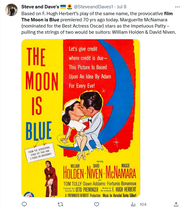 This all happened four years before I was born, but it seems from the vantage point of 2023 to have occurred centuries ago.  Why?  Because the first chink in the armor of voluntary censorship had been made and the films soon reflected completely amoral and immoral attitudes about sex.  Usually those seeking to uphold the Production Code are depicted as villains when the tale of The Moon is Blue is told, but they were actually the visionaries who had a sense of where this would all lead.  The mainstreaming of pornography is one of the most devastating events in the past seven decades and in the US the avalanche began with this film.  The Devil is always most successful when he starts small.