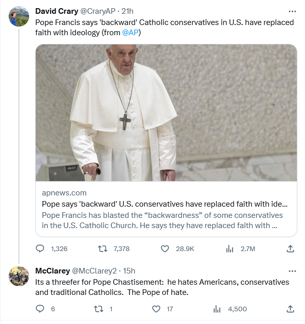 Firstly, I mean if he despises Americans that much why does he worry about the state of affairs of the US Church? Secondly, if only it were true that the US Bishops are hi-jacked by Conservatives. If that was the case, then you’d have the denial of the Eucharist to the likes of Biden and Pelosi.