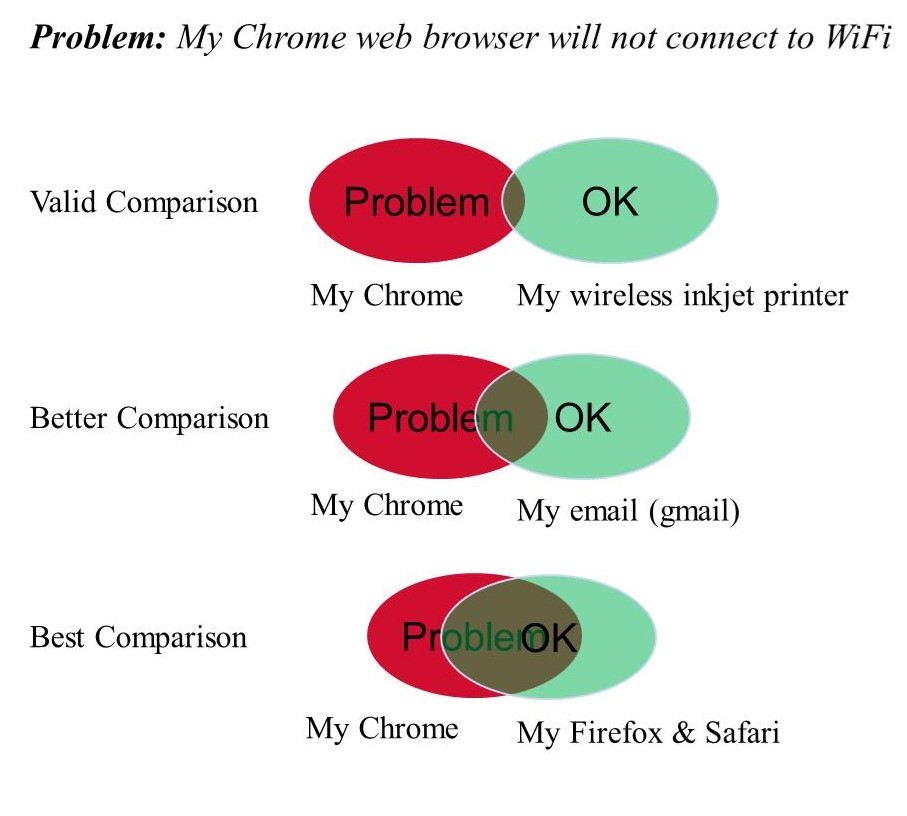 When problem-solving, it’s helpful to study opposites as well. Ask, “What is not a problem?” Suppose your Chrome web browser will not connect to the internet through your Wi-Fi. If your wireless printer is OK, your Wi-Fi is likely working fine. If your email gets through, your PC is likely OK also. If your Firefox & Safari browsers are working, then the Chrome application itself is suspect.