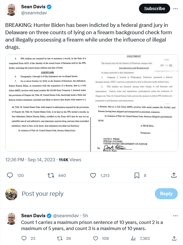 So what do the charges against Hunter Biden mean? I suspect it means that Joe Biden is not going to run for a second term. His consolation prize is that he gets to pardon his son, something he could not do if he were running again without risking a huge political firestorm. Stay tuned.