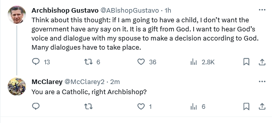 Not sure what His Excellency is trying to say here— and the ambiguity of this tweet might be intentional. After all, orthodox Catholics could read this as a declaration that the state has no right to decide how many children couples can have. And pro-abortion folks can read this as suggesting the state shouldn’t restrict abortion.