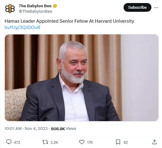 “We are honored to welcome such an austere scholar to these hallowed halls,” said Harvard President Claudine Gay. “Mr. Haniyeh brings with him a wealth of knowledge and experience in diplomacy, public relations, and terrorizing innocent Jews — all things we prize highly here at Harvard. We know his valuable and unique perspective will expand the young minds who come here to learn.”