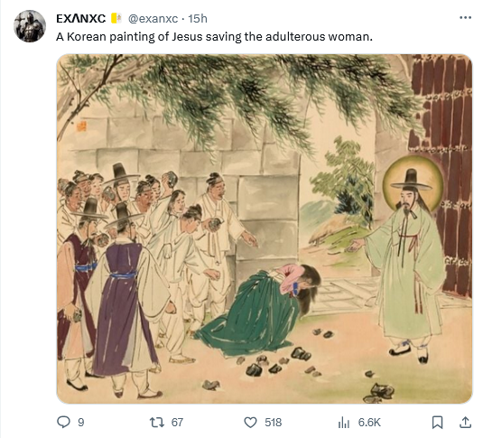 Go and sin no more. One of the more overlooked passages in The Bible, especially as it comes from this famous incident. Christ of course was without sin. It was for Him to cast the first stone. Whereas the Law of Moses was to punish sin, the Light of Christ is to redeem us from our sins and to have us lead lives free from serious sin. The best depictions of this event have the men holding stones listening to Christ as He changes their hearts, with their faces mirroring this difficult process.
