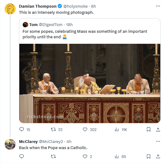 The recent unveiling of Francis’ lukewarm attitude toward the Mass is not surprising, IMO. For years it has been noted that he tends to scowl at the Blessed Sacrament when he kinda sorta elevates it after the prayer of consecration. No look of wonder or awe or love such as I have seen on the faces of faithful priests over my 18 years as a Catholic. (That’s one advantage, maybe the only one in my book, of “versus populum” celebration.) Sometimes I wonder if he even believes in the Sacrament itself, which in turn might explain his attitude toward the Liturgy. Is there any record of his preaching or writing in unambiguous terms about the Real Presence? I honestly don’t know, nor have I the time to waste trying to find out.