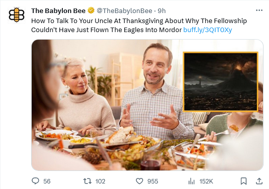 Sigh. It’s hopeless. Or is it? Using these conversational techniques and talking points, maybe you can navigate the minefield of contentious conversations about the Fellowship of the Ring’s bold gambit to walk the Ring all the way into Mordor.