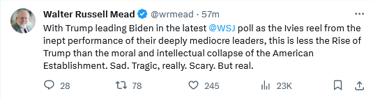 Elizabeth Magill was born in 1966. That’s about the vintage of our current institutional leadership. Every once in a while you encounter someone from those cohorts who does business in a way which suggests that ethical norms, professionalism, civic spirit, and patriotism are binding obligations for them. Most such people seem to come from older cohorts. Most people in charge of anything seem like crooked institutional politicians who can hardly utter an honest word. Same deal for people in word merchant occupations. A great deal of public discussion seems lunatic because it is conducted by people who never stop lying to themselves and lying to others (but are regrettably in a position to injure non-liars).