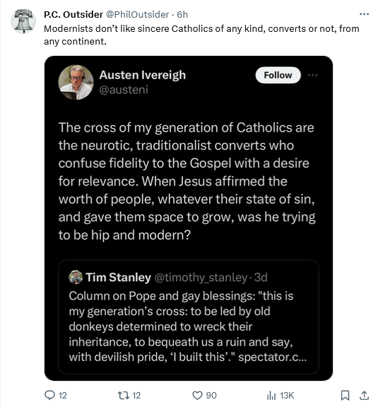Once again, I notice a trend. Mr. Tim says the pope has done this, and this is the cross we bear. Mr. Ivereigh then responds with a screed of insults and accusations and assumption of malicious motives. Ever notice how much progressive activism depends on assuming worst motives among those who disagree?