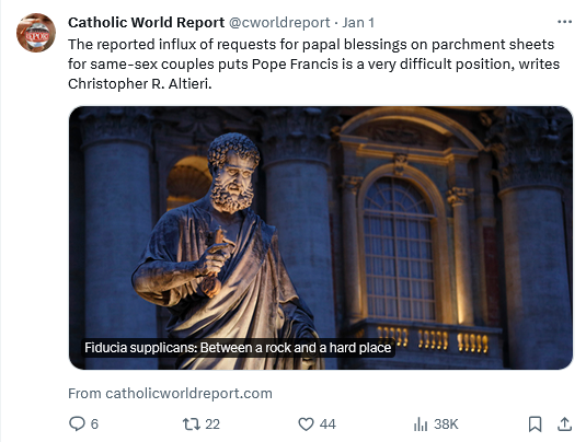 […] Gay Blessings on Papal Parchment? – Christopher R. Altieri at The Catholic World Report The Price to Pay For Bowing to the Lavender Mafia – Don. R. McClarey, Esq., at The American Catholic Resistance to Same-Sex Blessings Grows in […]
