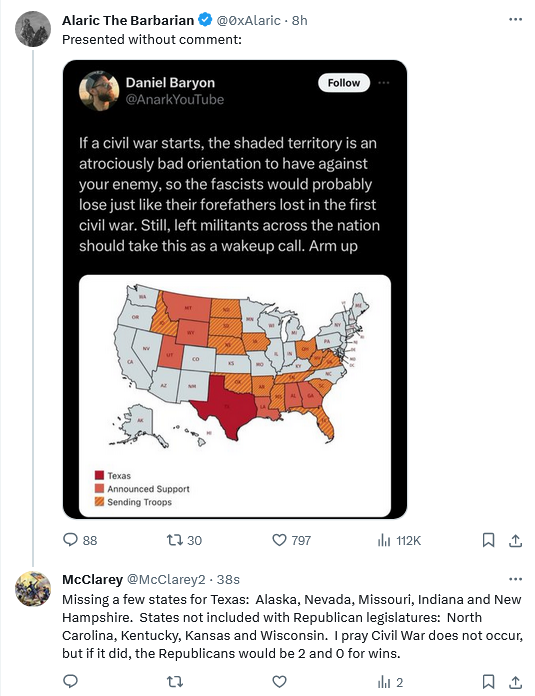 State Boundaries would not apply in God forbid… another Civil War, plus only Republicans are 1-armed and 2-motivated by the US Constitution (what unarmed beta male dem would give his life for: transgenderism, sodomy, intersectionality, DEI, open borders or abortion?)