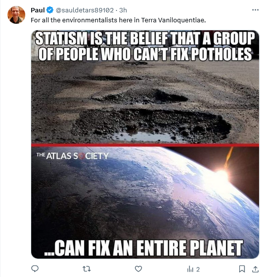 If your local highway department is not fixing potholes, you ask why they aren’t. There isn’t an alternative to your local highway department. (I haven’t lived in a place where potholes were a problem since 1981, btw. There is a problem with the design of the road where I live, but that’s not an issue with road crews themselves). The problem with the global warming discourse is not that it expects government employees to do something, but that it shows telltale signs of being another set of excuses for officious people to harass others. The chaps who pick up your trash are not officious people.
