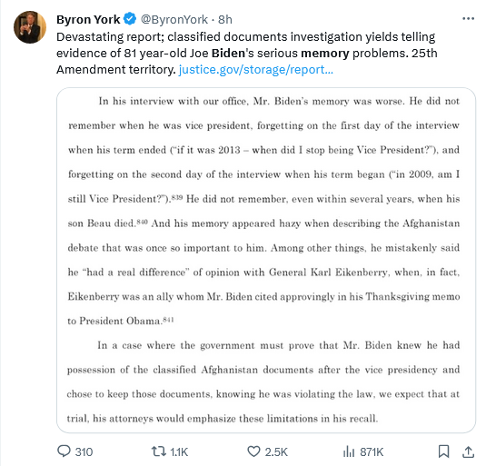 Democrats and others expressed outrage at the way special prosecutor Robert Hur chose to explain this decision—but what else exactly was Hur supposed to say? He had to produce a report. He had to lay out why he wasn’t going to try to bring a case against Biden. He did. What he said was that Biden had sat for an interview with his team and that the president’s memory was so poor and his capacity for recollection so feeble he came across as non compos mentis.