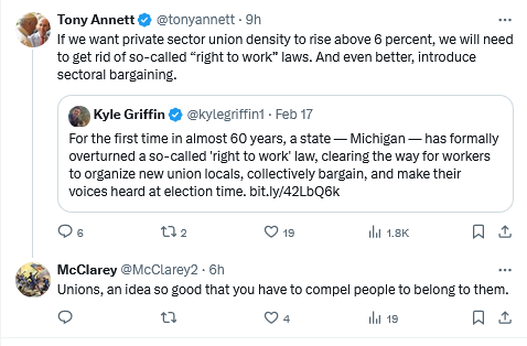 Non-academic critics of the Roosevelt Administration (Megan McArdle excepted) usually fail to call attention to its worst feature (and one that came right from the top): it’s affection for cartels, production controls, price controls, and price manipulation. This was manifest in both goods and services markets and in factor markets. The Supreme Court did the country a service by tossing out the National Industrial Recovery Act, but they regrettably left many similar measures in place prescribed by other pieces of legislation. The model of industrial relations prescribed by the Wagner Act was contentious, partial to the noted tendency in Administration policy, and did nothing to inhibit the dominance of unions by machine bosses and (now and again) outright gangsters. When Annett says ‘sectoral bargaining’, what he means is a revival of master contracts which cover whole industries. You used to have that in the auto industry. The auto industry in 1966 had about five producers; Annett wants the model applied across the board, no matter what the market structure. You can look at the condition of General Motors in 2009 and see how well that worked out for everyone.