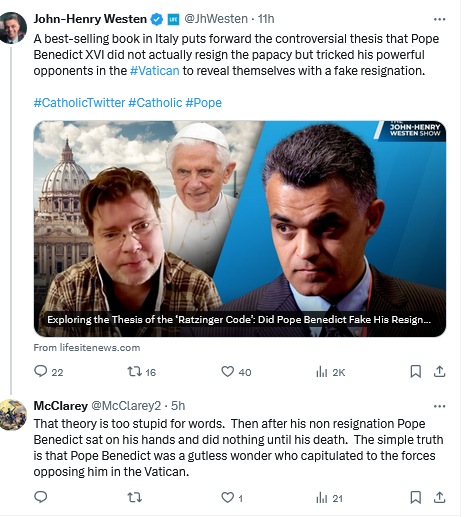 Certainly agree on the stupidity of the false resignation theory. I’m not sure yet that B-XVI was a gutless wonder, although that’s clearly possible. I want to know more about what he was threatened with, and by whom, and which people he trusted. He obviously did not have the type of inner strength JP-II had, and I do feel betrayed by the whole process starting with the resignation. However, I believe we need more facts to arrive at a final assessment, and those facts must be buried very deeply by now.