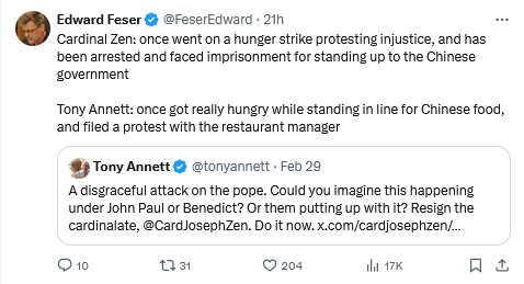 I pray I live to see what the Team Bergoglio Twitterati like this guy have to say, when we actually have a faithful Catholic again in the See of Peter. It should be…interesting.