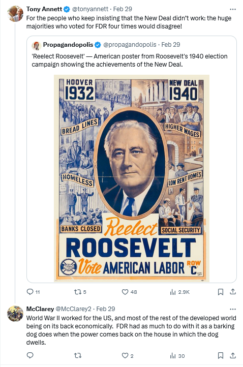 I’m not comparing FDR to Hitler, but Hitler had huge majorities too. The fact that you can convince a lot of people to go insane all at once isn’t an argument that it was a good idea.
