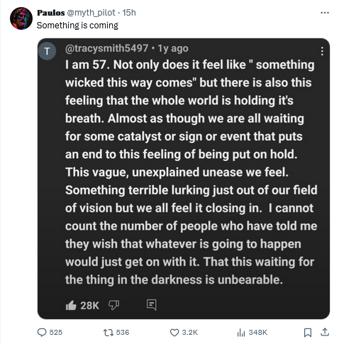 I’m not sure he’s talking about the end of times. He seems to be saying what I’ve heard many say in recent years. That we are on the brink of something. Something likely big and world changing, like the world in August, 1939. Or 1913 for that matter. Or in the US in the 1850s. That what we are seeing is not sustainable, and something is going to give. I agree with that, because I feel it too. Not in a ‘the Second Coming is nigh’ sense, but in the “‘why didn’t they see it coming?’ asked future generations” sense.