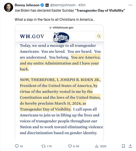 Apparently the Transgender Day of Visibility has been observed on March 31 every year since 2008, however, it has never been marked by an official presidential proclamation until the Biden administration. They could have waited until Monday, April 1, or even Tuesday, April 2, if they didn’t want it coinciding with April Fool’s Day. Or they could have moved it up to before Holy Week.