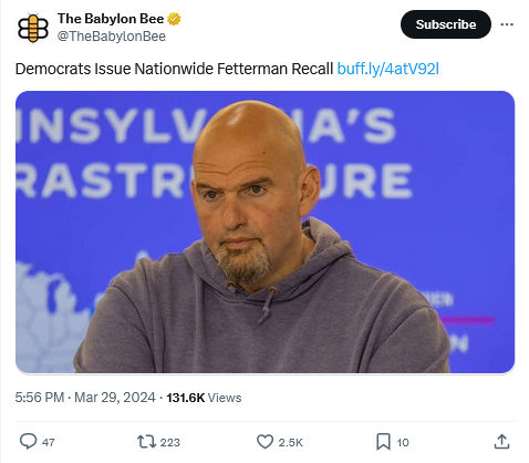 “We thought he’d be a reliable Democrat, but he’s just not functioning correctly,” said one Democrat official. “Once a product starts to fail in its intended purpose, it can become dangerous. We needed to get out ahead of this problem and issue a nationwide Fetterman recall to avoid things getting worse. Hopefully, we can round up all of the Fetterman out in circulation and keep it from causing any more issues.”
