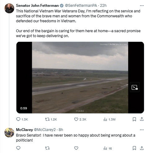 I’m reminded of the parable of our Lord about the two sons who were asked by their father to work in the field. One said the wrong things but did the right things, and the other said the right things but did the wrong things. In this parable, Fetterman would be the bad son.