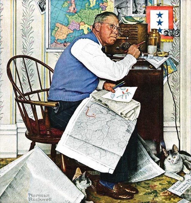 Touching Norman Rockwell picture. The three star flag indicates that the family has three sons in service. The photographs indicate they are serving on sea, on land and in the air. Their Dad is keeping up with the war news, tracking as best he can where his boys are. The old man likely served in World War I. The cats at his feet are a nice touch.