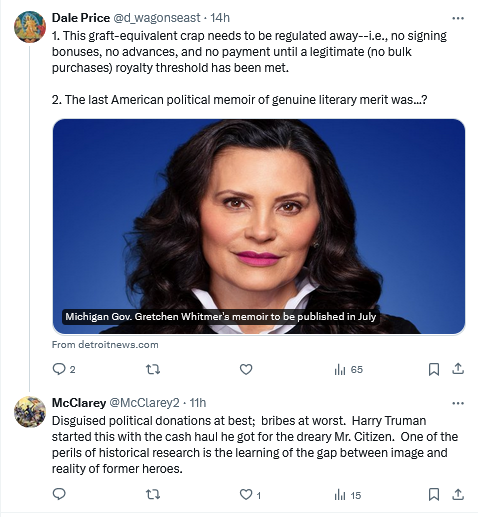 You remember when the Speaker of the House was drummed out of office for a bogus book deal? (55% royalties on a ‘book’ which vended through bulk purchases by people who wanted something from him). That was in 1989. The advent of the Clintons was coincident with a catastrophic fall in standards of propriety.