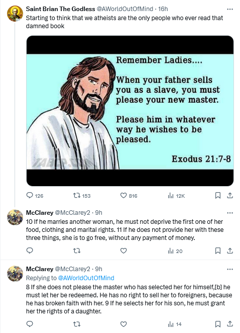 BTW, I looked at the Twitter page of https://twitter.com/AWorldOutOfMind (Saint Brian the Godless). I was going to post the excerpt from Deniis Prager on this part of Exodus, but he’s not worth conversing with. I am very sorry, but some people simply are not worth the effort of arguing with.