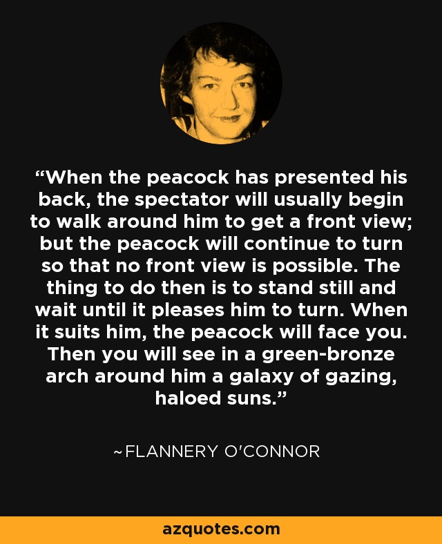 I will remember the quote the next time a peacock in full display blocks the single lane road from my house, and reflect. Perhaps a smile and simple “Thanks!”, instead of my usual “Outta my way, ya damn dumb bird!” Love them, though.