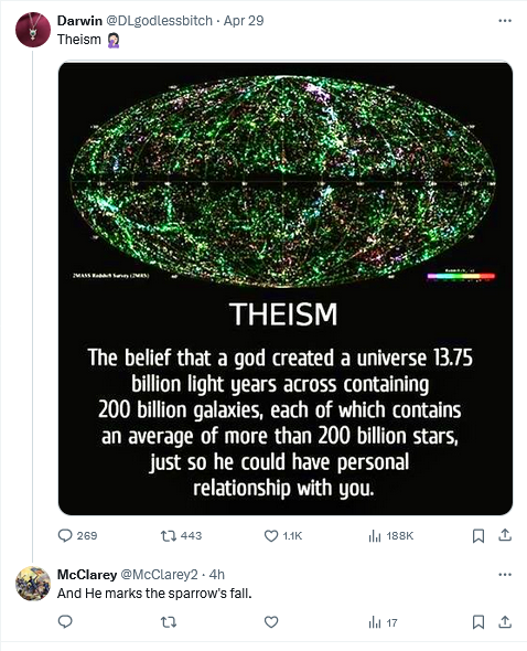 D. Things like extension in space (size) and linear duration (time) are taxonomies that limited creatures apply to created material things, and thus measured in relation to the measurer. The meme and its author thus engage in what I like to call the “God-too-small” fallacy in which one judges relative importance by these taxonomies and projects them as absolute measurements upon the created order.
