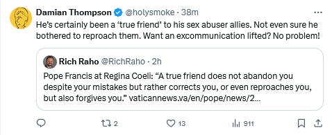 The primary problem in the Roman Catholic Church today is its hierarchical failure to address the core problem resulting from the uncanonical resignation of pope Benedict xvi and its disastrous consequences . A fish rots from the head.