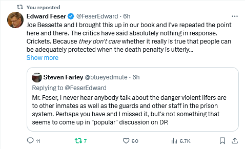 I have always viewed opponents of capital punishment as those to seek to improve on the approbation of the Almighty in the matter. They continually come up with arguments against the punishment and/or the protective purpose of the death penalty. The fact that they fail on logic, revelation and natural law bothers them not a whit.