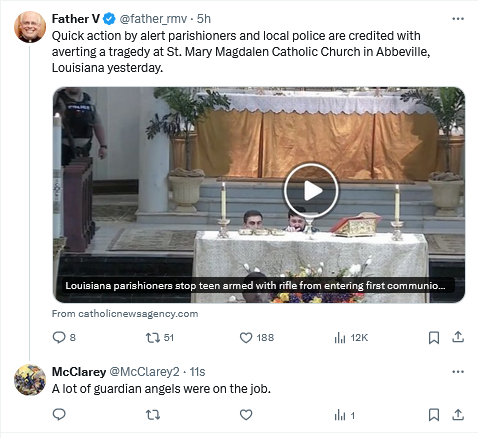 The Saint Michael prayer should be said at every Mass, and every church needs a plan as to what to do in this type of situation.  Bravo to the alert and brave parishioners.