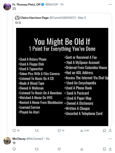I did everything on the list except My Space, Columbia House, and an AOL address. Other really “old” things I’ve done include: took courses in shorthand, BASIC and COBOL programming; watched black & white TV; used a public pay phone; called the time and temperature hotline; drove a car that had only an AM radio; climbed jungle gyms/monkey bars on an asphalt paved or gravel playground; and jumped off a 20 foot high diving board at a public swimming pool (no public pool that I know of has any diving boards these days, probably due to liability/insurance issues).