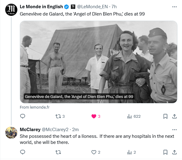 Mademoiselle Genevieve de Galard-Terraube, French Airborne Nurse, by her ministrations to the sick and wounded at Dien Bien Phu, inspired and heartened the entire free world. Her service to her comrades, marked by the courage of a woman in battle and by the devotion of a nurse to her sworn duty, has been unsurpassed in this century. Her supreme fortitude in hours of peril, her unfaltering dedication to her mission reflected the greatness of spirit manifested on many fields, in many centuries, by the soldiers of France.